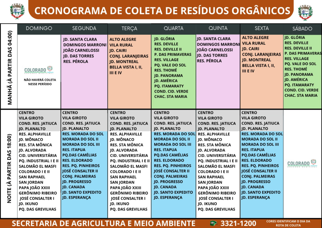 A Prefeitura Municipal de Colorado-PR informa à população o novo cronograma de coleta de resíduos orgânicos no município. A atualização tem como objetivo melhorar a organização do serviço e garantir mais eficiência no recolhimento dos resíduos domiciliares, atendendo de forma ordenada todas as regiões da cidade.
