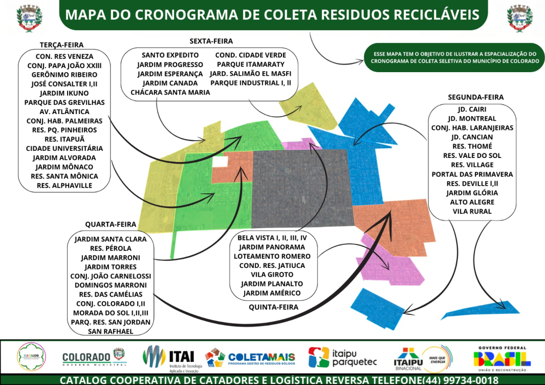 A Prefeitura Municipal de Colorado-PR, em parceria com a Catalog – Cooperativa de Catadores e Logística Reversa, lançou nesta semana o novo cronograma de coleta seletiva do município, que passa a integrar o Programa Coleta Mais. A iniciativa conta com o apoio do Instituto de Tecnologia Aplicada e Inovação (ITAI), Itaipu Parquetec, Itaipu Binacional e Governo Federal.