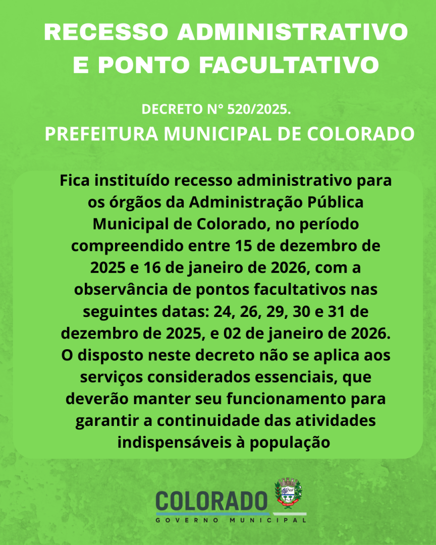 RECESSO ADMINISTRATIVO E PONTO FACULTATIVO Publicado em 12 de dezembro de 2025 às 17:14 hs. | Geral Compartilhe: